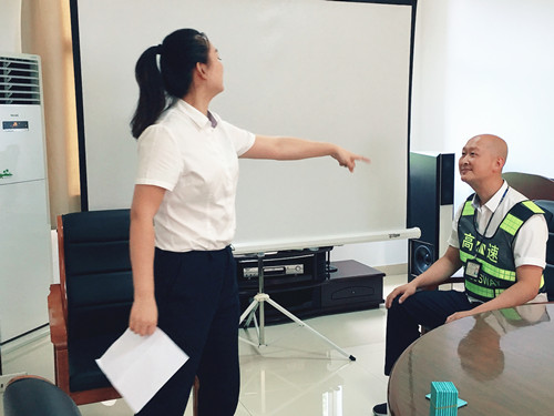 圖為員工扮演駕駛?cè)藛T 此次培訓(xùn)一改枯燥乏味的傳統(tǒng)形式,工作人員結(jié)合平時窗口實際工作,分別擔(dān)任角色扮演,生動而又形象地演繹窗口服務(wù),真實地反映出收費員在收費過程中遇到的各類情景。比如:ETC車道無法正常通過、遇堵車分流、駕駛員情緒激動、綠農(nóng)車混裝未達(dá)到免費、入口如何勸離超限車輛等各類突發(fā)事件應(yīng)急處理辦法。