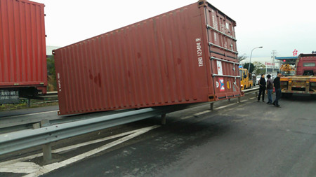 12月15日10:10分左右,一輛車牌為浙B88C06的集裝箱車在臺(tái)州南副站選擇出口車道時(shí),因變道和出口運(yùn)載汽車的長(zhǎng)掛車發(fā)生碰撞,使得未鎖牢的集裝箱箱體甩落下來,砸到護(hù)欄及進(jìn)口一輛正在通行的貨車車頭,造成護(hù)欄變形、貨車車頭受損嚴(yán)重,所幸無人員受傷。