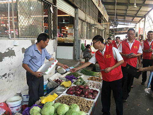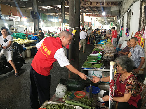 圖為志愿者在菜場宣傳垃圾分類 志愿者們特地選取菜市場、商鋪等人多且容易產(chǎn)生垃圾的地方,向店主和商販們宣講環(huán)境公害引發(fā)的負面后果及如何處理平時的生活垃圾,他們結(jié)合宣傳冊通俗、耐心地講解生活垃圾要從源頭開始分類投放:干濕要分開,對剩菜剩飯、瓜皮果殼等易腐垃圾要瀝干水分,投放后要蓋好垃圾桶,免得蚊蠅滋生;紙類、飲料瓶、金屬等有再生利用價值的要放在可回收的垃圾桶里;對電池、電子產(chǎn)品、殺蟲劑、油漆桶等含有害化學物質(zhì)的要單獨放;剩余的作其它垃圾處理。