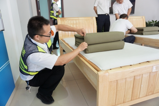 圖為比賽現(xiàn)場(chǎng) 活動(dòng)現(xiàn)場(chǎng),裁判宣布比賽規(guī)則及打分標(biāo)準(zhǔn):評(píng)分從被子整體形狀、平整度、棱角明顯、折疊時(shí)間等方面判斷,規(guī)定在5分鐘內(nèi)完成,共設(shè)置一、二、三等獎(jiǎng)三個(gè)獎(jiǎng)項(xiàng)。內(nèi)務(wù)半軍事化在該所已是常態(tài),參賽選手們很快進(jìn)入狀態(tài),從鋪到疊再到整,駕輕就熟,均能在規(guī)定時(shí)間內(nèi)整出“豆腐塊”。評(píng)委現(xiàn)場(chǎng)進(jìn)行點(diǎn)評(píng)和打分。經(jīng)過競(jìng)逐,最后副站收費(fèi)四班何翊平奪得一等獎(jiǎng)。比賽分四輪進(jìn)行,且全程用時(shí)不到1個(gè)小時(shí)。