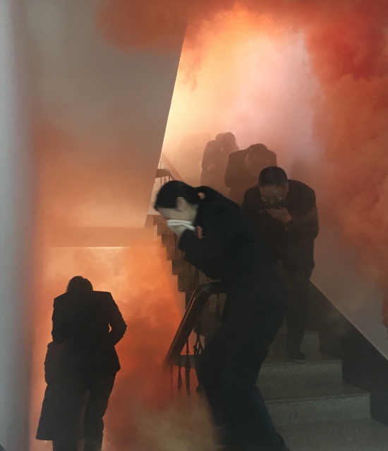 圖為樓道逃生演練 在樓道逃生演練中,大量煙霧彌漫,員工們熟練掌握逃生自救的要領:個個用濕毛巾捂住口鼻,彎腰、沿著樓道有序快速往下逃離。 大家在突發事件面前臨危不懼、配合默契,保證了其它車輛的有序通行。在面對突發火災,也能做到有序、快速撤離。通過演練,各崗位人員不僅增強了安全意識,也提高了對應急預案的熟悉程度和面對突發事件的反應、處置和自救能力。 夏蓮萍