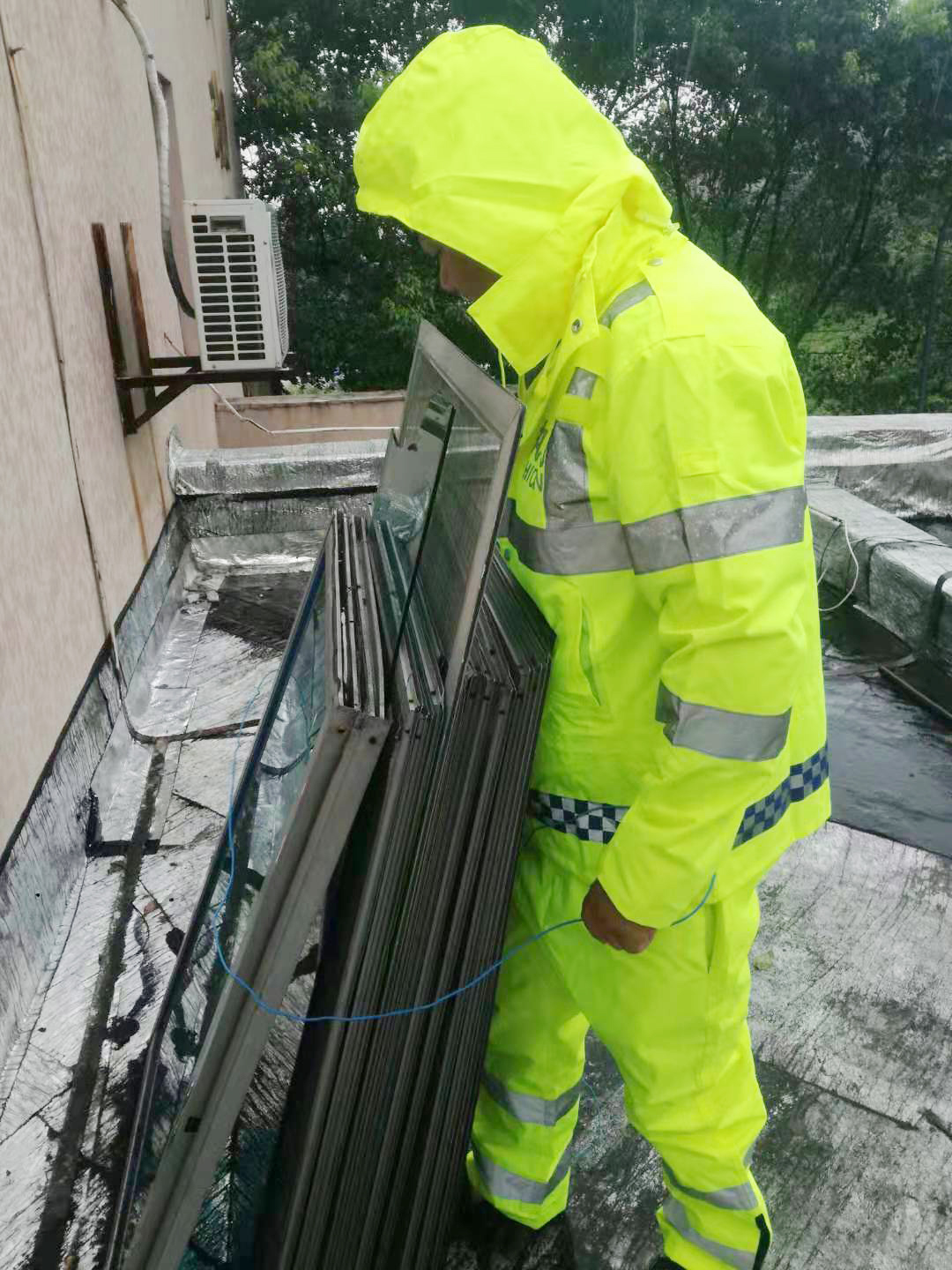 圖為工作人員捆扎散落的物品 8月9日上午,超強臺風帶來強降雨,大溪嶺隧道所隊員們做好一切防臺準備,備好發電機所需燃油,保證所有車輛車況良好并加滿油;充分備好繩索、應急燈、雨衣雨靴、藥品、食物等防臺物資;檢查各類通訊線路,確保內部通訊電話、報警電話等重要線路暢通;放下北廣場的二高桿燈。隊員們爬到屋頂,對散落的物品進行捆扎,并疏通堵塞的排水管,確保排水設施良好。所有人員全力做好防臺部署工作和防御措施,確保大溪嶺隧道一切設備正常運行,隧道平安暢通。 陳智慧