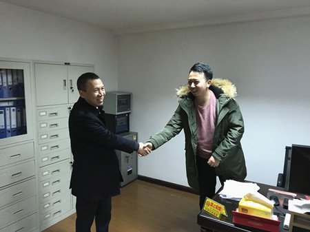 圖為集團副董事長、總經理張建平在慰問中與部門員工親切握手