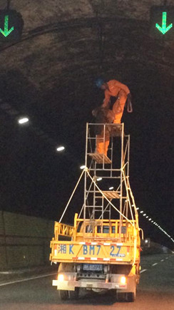 圖為施工人員在隧道內拆除中排燈 塘嶺隧道自建成通車到現在已近20年,隧道兩頭中間位置,一排用來加強照明高壓納燈為2011年機電改造工程的遺留物,屬報廢燈具。如今,由于上方用于固定納燈鐵架已出現不同程度腐爛,有些納燈已出現晃動現象,一旦斷落,勢必給高速行車埋下安全隱患。集團公司領導得知這一情況后高度重視,當即委派工程部維養中心組織力量,負責聯系拆除。