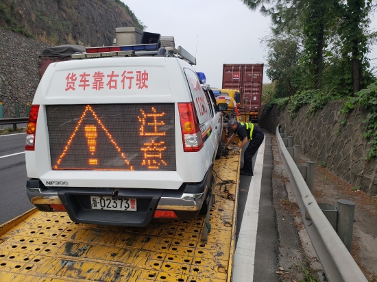 巧合的是,當(dāng)天下午四點,這里曾在救援中幫助過施救中心的警車因為輪胎故障,被迫停在寧向黃土嶺外的緊急停車帶上,又是兩人將該車平安救下高速。