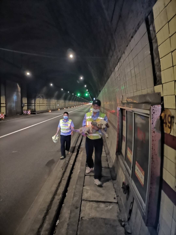 為確保安全,執(zhí)勤隊(duì)員們帶上手套,拿著掃把和麻袋,到達(dá)現(xiàn)場(chǎng)后發(fā)現(xiàn)是一只白色的拉布拉多犬,它一動(dòng)不動(dòng)地趴著,可憐巴巴地看著隧道里的車子極速而過(guò),很顯然小狗感覺(jué)到害怕,知道趴在這里才是最安全的。隧道所安保人員陶文輝再三確認(rèn)小狗沒(méi)有攻擊意圖后,試著慢慢靠近它,給它喂食香腸,并耐心安撫,直至順利地將其抱起,帶上了巡邏車。狗是靈性的動(dòng)物,認(rèn)準(zhǔn)了第一個(gè)抱起它的陶文輝,乖乖地依偎在他的懷里。 此前,隧道里從未出現(xiàn)寵物狗被遺忘的事,執(zhí)勤隊(duì)長(zhǎng)忙回到監(jiān)控室查看錄像,準(zhǔn)備幫它尋找主人,經(jīng)過(guò)仔細(xì)查找終于發(fā)現(xiàn)隧道里有過(guò)一次大堵車,小狗就是那個(gè)時(shí)候被主人遺忘的。按照時(shí)間推算,這條小狗已經(jīng)在隧道里呆了近14個(gè)小時(shí),還好它聰明,趴在那兒一動(dòng)不動(dòng)沒(méi)有到處亂跑。最后經(jīng)過(guò)半個(gè)多小時(shí)的查找,隊(duì)長(zhǎng)終于與車主取得聯(lián)系,晚上22點(diǎn)左右,車主來(lái)到大溪嶺隧道所認(rèn)領(lǐng),多次感謝我們對(duì)小狗的救援和照顧。 孫鵬