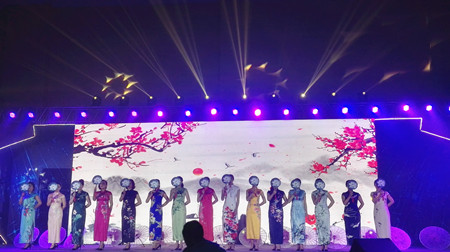 圖為旗袍秀現(xiàn)場 晚會一開場,由椒江區(qū)前所街道前所村(全國文明村)表演的鑼鼓舞《歡慶新時代》馬上將觀眾帶入到熱烈的氣氛中。隨后,各家單位選送的15個節(jié)目以小品、舞蹈等多種形式,展示學習貫徹落實十九大的成績,歌頌新時代黨領導下的新氣象。 公司員工包德福代表公司參加晚會,獨唱歌曲《天際》,其動聽的歌聲贏得了現(xiàn)場觀眾的陣陣掌聲和喝彩。 周茂森